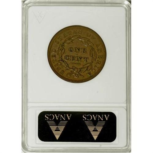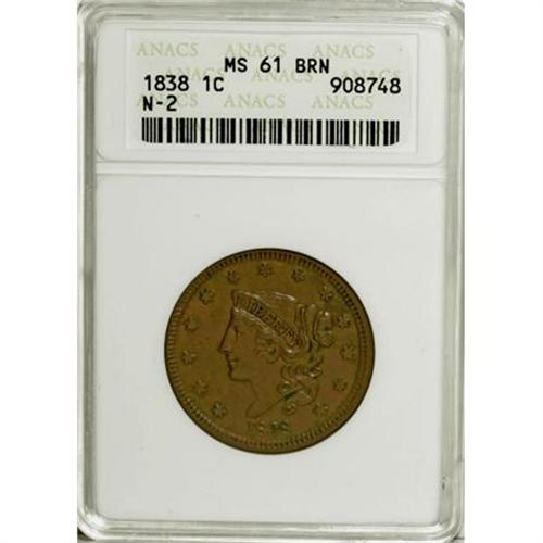 <B>1838 1C MS61 Brown ANACS.</B></I> N-2. NGC Census: (25/322). PCGS Population (5/196). Mintage: 6,370,200. Numismedia Wsl. Price for NGC/PCGS coin in MS61: $217. (#1741)<BR><BR><B>Coin Engraver:</B> Robert Scot or John Reich<BR><BR><b>Shipping:</b> Coins & Currency (<a target="_blank" href="http://www.heritageauctions.com/common/shipping.php">view shipping information</a>)