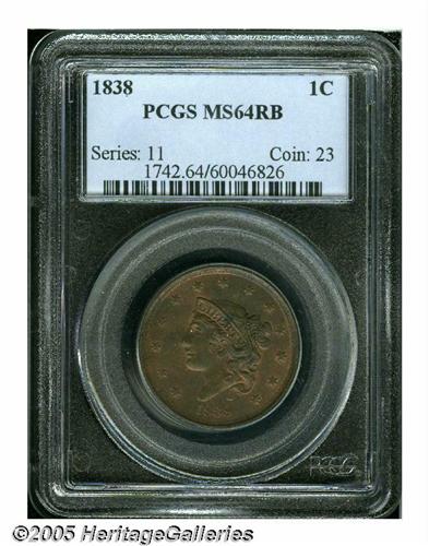 <B>1838<1C> MS64 Red and Brown PCGS.</B></I> N-8, R.1. A late die state with softly defined denticles and mint-made flow lines on Liberty's neck. An exceptionally unabraded near-Gem that has ample portions of slightly faded orange-gold color. The design elements are generally well struck. All of the star centrils show, but some are a bit soft. Small toning spots above the E in LIBERTY and below the first T in STATES are of little importance. Population: 24 in 64, 20 finer (3/05).