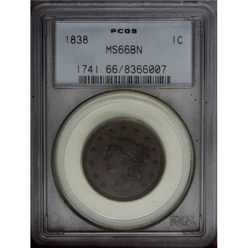<B>1838<1C> MS66 Brown PCGS.</B></I> N-7, R.1. Medium olive and dark brown color across both sides in a woodgrain pattern that is typical of large cents from this era. Very light flowlines are visible on both sides with a resultant weakening of the peripheral details. The surfaces are exceptionally pleasing. EAC 60.<BR><I>From The Craig A. Stevens Registry Collection of Large Cents.</B></I> <BR><BR><B>Important notice:</B> Heritage usually auctions material at the rate of 200-250 lots per hour. On some occasions eBay Live bid software or the Internet may not be able to keep up with the pace of the auction. We recommend placing a realistic absentee bid now as insurance to avoid disappointment. Occasionally the auctioneer may eliminate or reject an eBay Live bid, and the auctioneer may also reopen a lot after the close of the eBay live bidding (usually because we missed an audience bid), and may reject your bid even if it shows you as the winning bidder. By bidding via eBay Live, you agree that Heritage may award the lot to another bidder at its sole discretion under the circumstances described above or any other reasonable circumstances. Since eBay bids are not shown to us until we open the lot on the floor, we treat those bids just like floor bids. In most cases the floor responds before the eBay bid is presented to us, due to Internet lag time, so for consistency we have made it a policy that floor bids are always considered first over tie eBay live bids. Also please note that all Heritage lots purchased through eBay Live carry a 20% Buyer's Premium. Please make sure you read the Terms and Conditions before you bid. This lot is being auctioned in conjunction with a live floor auction by Heritage Galleries & Auctioneers. All final auction and invoice information will be supplied by Heritage Galleries & Auctioneers, and all other information should be considered preliminary. Lot:291 <BR><BR><B>Winning Notification and Billing:</B> After the FINAL session in this auction is complete, Heritage will send e-mail and snail mail invoices. This process normally takes several days. All final auction and invoice information will be supplied by Heritage Galleries & Auctioneers, and all other information should be considered preliminary. <BR><BR>This auction will be conducted on a live auction floor and over the Internet through eBay Live. If you choose to place an absentee bid, please take a moment to <font color='#0000ff'><u><a href='http://pages.ebay.com/liveauctions/help/before/laabsentee.html'>learn how eBay Live absentee bidding works</a></u></font><font color='#000000'>