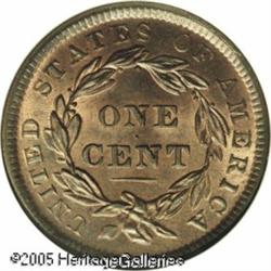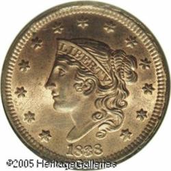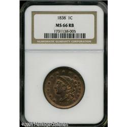 <B>1838 1C MS66 Red and Brown NGC.</B></I> N-1, R.1. The O in OF is entered low, and the left side of the I in UNITED is recut. The 1 in the date is also repunched near the peak. A lustrous and splendidly preserved premium Gem with blended orange and lilac color. The centers are meticulously struck, and only a few of the upper stars do not possess sharp centrils. A later die state that has crumbling on the obverse rim at 12 o'clock. Population for all Newcomb varieties: 9 in 66 Red and Brown, 1 finer (1/05). Lot:5145