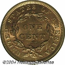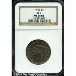 <B>1838<1C> MS66 Red and Brown NGC.</B></I> N-1, R.1. The O in OF is entered low, and the left side of the I in UNITED is recut. The 1 in the date is also repunched near the peak. A lustrous and splendidly preserved premium Gem with blended orange and lilac color. The centers are meticulously struck, and only a few of the upper stars do not possess sharp centrils. A later die state that has crumbling on the obverse rim at 12 o'clock. Population for all Newcomb varieties: 8 in 66 Red and Brown, 1 finer (8/04). <BR><BR><B>Important notice:</B> Heritage usually auctions material at the rate of 200-250 lots per hour. On some occasions eBay Live bid software or the Internet may not be able to keep up with the pace of the auction. We recommend placing a realistic absentee bid now as insurance to avoid disappointment. Occasionally the auctioneer may eliminate or reject an eBay Live bid, and the auctioneer may also reopen a lot after the close of the eBay live bidding (usually because we missed an audience bid), and may reject your bid even if it shows you as the winning bidder. By bidding via eBay Live, you agree that Heritage may award the lot to another bidder at its sole discretion under the circumstances described above or any other reasonable circumstances. Since eBay bids are not shown to us until we open the lot on the floor, we treat those bids just like floor bids. In most cases the floor responds before the eBay bid is presented to us, due to Internet lag time, so for consistency we have made it a policy that floor bids are always considered first over tie eBay live bids. Also please note that all Heritage lots purchased through eBay Live carry a 20% Buyer's Premium. Please make sure you read the Terms and Conditions before you bid.