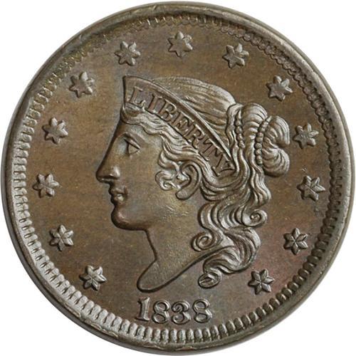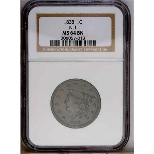 1838 1C N-1, R.1. MS64 Brown NGC. MS60 EAC. Rim breaks 1838[1C] N-1, R.1. MS64 Brown NGC. MS60 EAC.