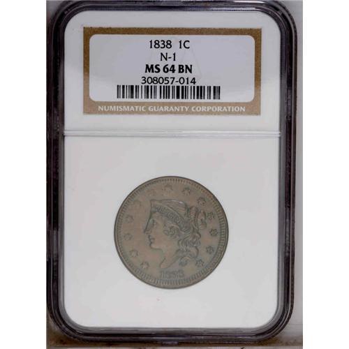1838 1C N-1, R.1. MS64 Brown NGC. MS60 EAC. This is on 1838[1C] N-1, R.1. MS64 Brown NGC. MS60 EAC.