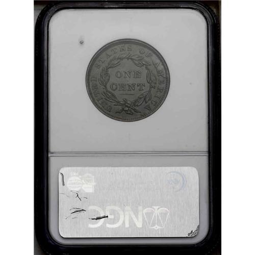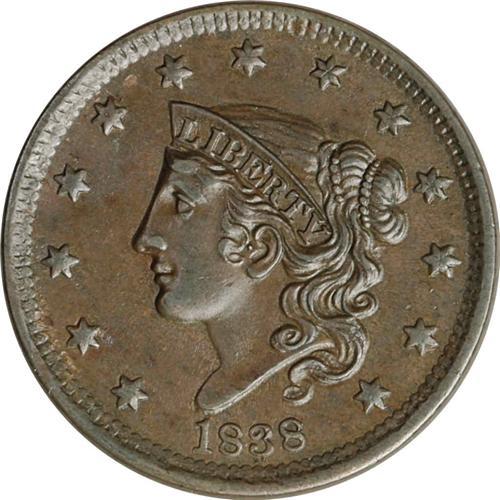 <B>1838<1C> N-10, High R.2. AU58 NGC. AU55 EAC.</B></I> This is a late state with the reverse crack extending through AM and over to F, the area above the crack starting to form a retained cud. This is one of the latest die states we have seen. Lovely medium olive surfaces with some remaining luster, and with hints of darker steel color on the devices.<BR><I>Ex: Del Bland (4/24/1970).</B></I>