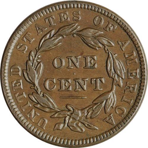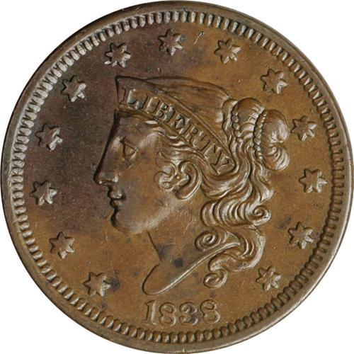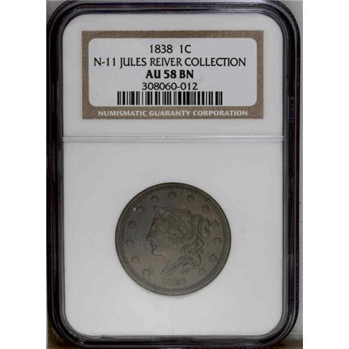 <B>1838<1C> N-11, R.2. AU58 NGC. XF45 EAC.</B></I> Newcomb varieties 11 and 13 are the same, being early and late die states, respectively. This early die state representative has many raised die lines on Liberty's neck. These disappear in later states due to die was lapped. The surfaces are mostly light olive-brown in color, although the upper left quadrant of the obverse is primarily maroon, and may have once exhibited light corrosion. <BR><I>Ex: George Ramont (8/9/1977).</B></I> Envelope Included.