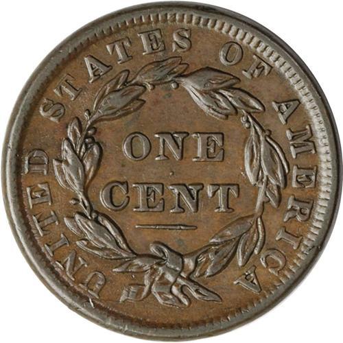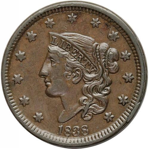 <B>1838<1C> N-4, R.1. AU55 NGC. XF45 EAC.</B></I> An important late die state example with a heavy crack through the left side of star 9, eventually reaching the 8 and 3 in the date, with a couple extended chips. Obverse rim break at star 13. This is a popular variety for its several obverse die states. John Wright reported on a session at the 1989 EAC Convention, where over 40 examples were studied with at least 11 resultant die states. Lovely olive-brown surfaces with deeper brown accents on the devices.<BR><I>Ex: George Ramont (4/17/1978).</B></I>
