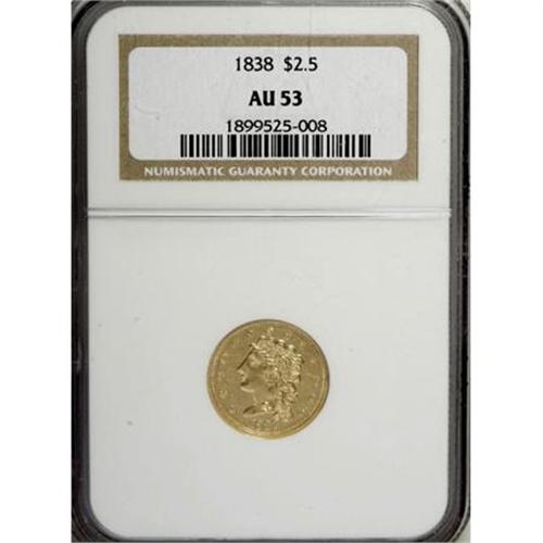 <B>1838 $2 1/2 AU53 NGC.</B></I> Breen-6146 R.2. The single variety for this issue. Pale lemon-gold surfaces with a hint of green at the margins. Both sides retain subtle luster despite a degree of wear on the well struck devices.<BR><BR><B>Coin Engraver:</B> William Kneass<BR><BR><b>Shipping:</b> Coins & Currency (<a target="_blank" href="http://www.heritageauctions.com/common/shipping.php">view shipping information</a>)