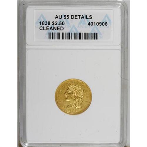 <B>1838 $2 1/2 --Cleaned--ANACS. AU55 Details.</B></I> NGC Census: (33/111). PCGS Population (18/39). Mintage: 47,030. Numismedia Wsl. Price for NGC/PCGS coin in AU55: $1,500. (#7696)<BR><BR><B>Coin Engraver:</B> William Kneass<BR><BR><b>Shipping:</b> Coins & Currency (<a target="_blank" href="http://www.heritageauctions.com/common/shipping.php">view shipping information</a>)