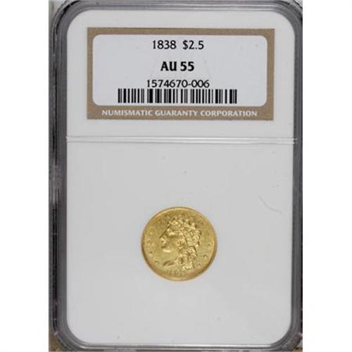 <B>1838 $2 1/2 AU55 NGC.</B></I> This is a scarcer issue in the brief (1834-1839) Classic quarter eagle series. This example displays somewhat soft striking details, as usual, with light wear and some wispy hairlines in the fields. Just 47,030 pieces were struck. <BR><BR><b>Shipping:</b> Coins & Currency (<a target="_blank" href="http://www.heritageauctions.com/common/shipping.php">view shipping information</a>)