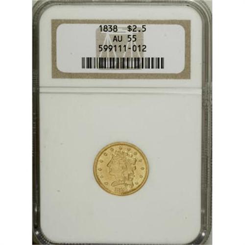 <B>1838 $2 1/2 AU55 NGC.</B></I> A nicely struck Classic quarter eagle that has ample luster and a few peripheral abrasions. A lower mintage issue struck from a single pair of dies.<BR><BR><B>Coin Engraver:</B> William Kneass<BR><BR><b>Shipping:</b> Coins & Currency (<a target="_blank" href="http://www.heritageauctions.com/common/shipping.php">view shipping information</a>)