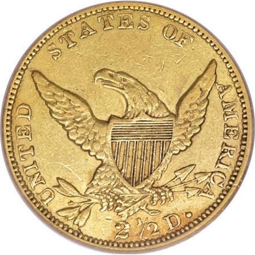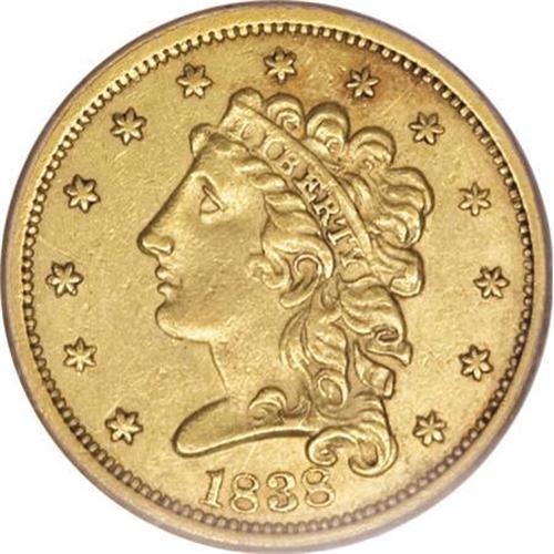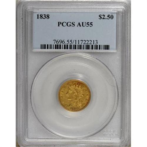 <B>1838 $2 1/2 AU55 PCGS.</B></I> Breen-6146, R.2. The 1838 Philadelphia mintage of 47,030 pieces was apparently coined by a single pair of dies. This yellow-gold Choice AU specimen displays a greenish cast, and is visited by splashes of reddish-gold. Sharp definition is apparent on the design features, and a few light circulation marks are noted on each side.<BR><BR><B>Coin Engraver:</B> William Kneass<BR><BR><b>Shipping:</b> Coins & Currency (<a target="_blank" href="http://www.heritageauctions.com/common/shipping.php">view shipping information</a>)