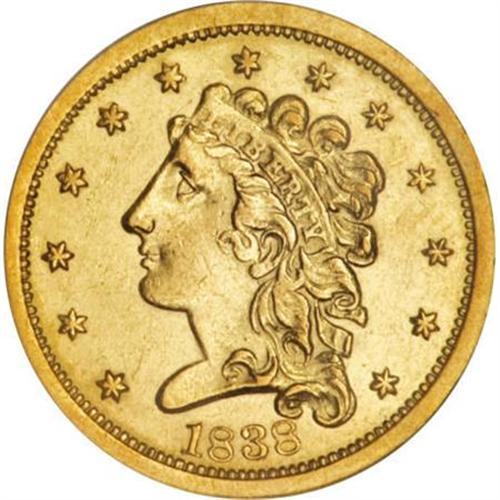<B>1838 $2 1/2 AU58 NGC.</B></I> The surfaces are somewhat prooflike on this charming and beautiful piece, which shows a paucity of abrasions, large or small. The upper left shield corner is only slightly weak, and the coin possesses an abundance of eye appeal overall. In 1838 the Charlotte Mint opened for business.<BR><BR><B>Coin Engraver:</B> William Kneass<BR><BR><b>Shipping:</b> Coins & Currency (<a target="_blank" href="http://www.heritageauctions.com/common/shipping.php">view shipping information</a>)