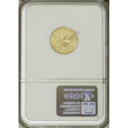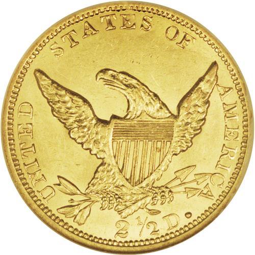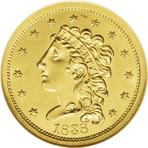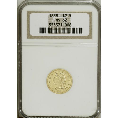 <B>1838 $2 1/2 MS62 NGC.</B></I> Just a single die pair is known for the 1838 quarter eagle, and the issue is even more scarce than its mintage of 47,030 pieces suggests. Yet it also affordable, probably because type demand is satisfied by the comparatively plentiful 1836. This sharply struck piece has pleasantly unmarked surfaces, and luster is especially prominent across the borders and devices. Census: 17 in 62, 26 finer (11/06).<BR><BR><b>Shipping:</b> Coin/Currency (<a target="_blank" href="http://www.heritageauctions.com/common/shipping.php">view shipping information</a>)