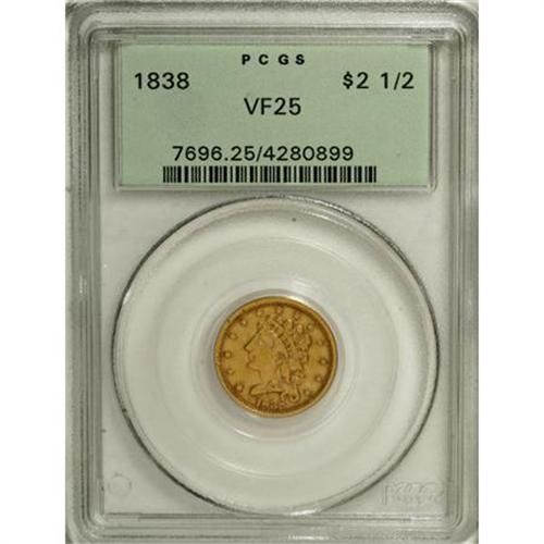 <B>1838 $2 1/2 VF25 PCGS.</B></I> PCGS Population (4/128). NGC Census: (1/204). Mintage: 47,030. Numismedia Wsl. Price for NGC/PCGS coin in VF25: $470. (#7696)<BR><BR><b>Shipping:</b> Coins & Currency (<a target="_blank" href="http://www.heritageauctions.com/common/shipping.php">view shipping information</a>)