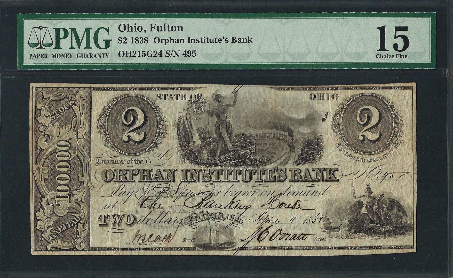 One 1838 $2 Orphan Institute's Bank Obsolete Note PMG Choice Fine 15. PMG Certified.