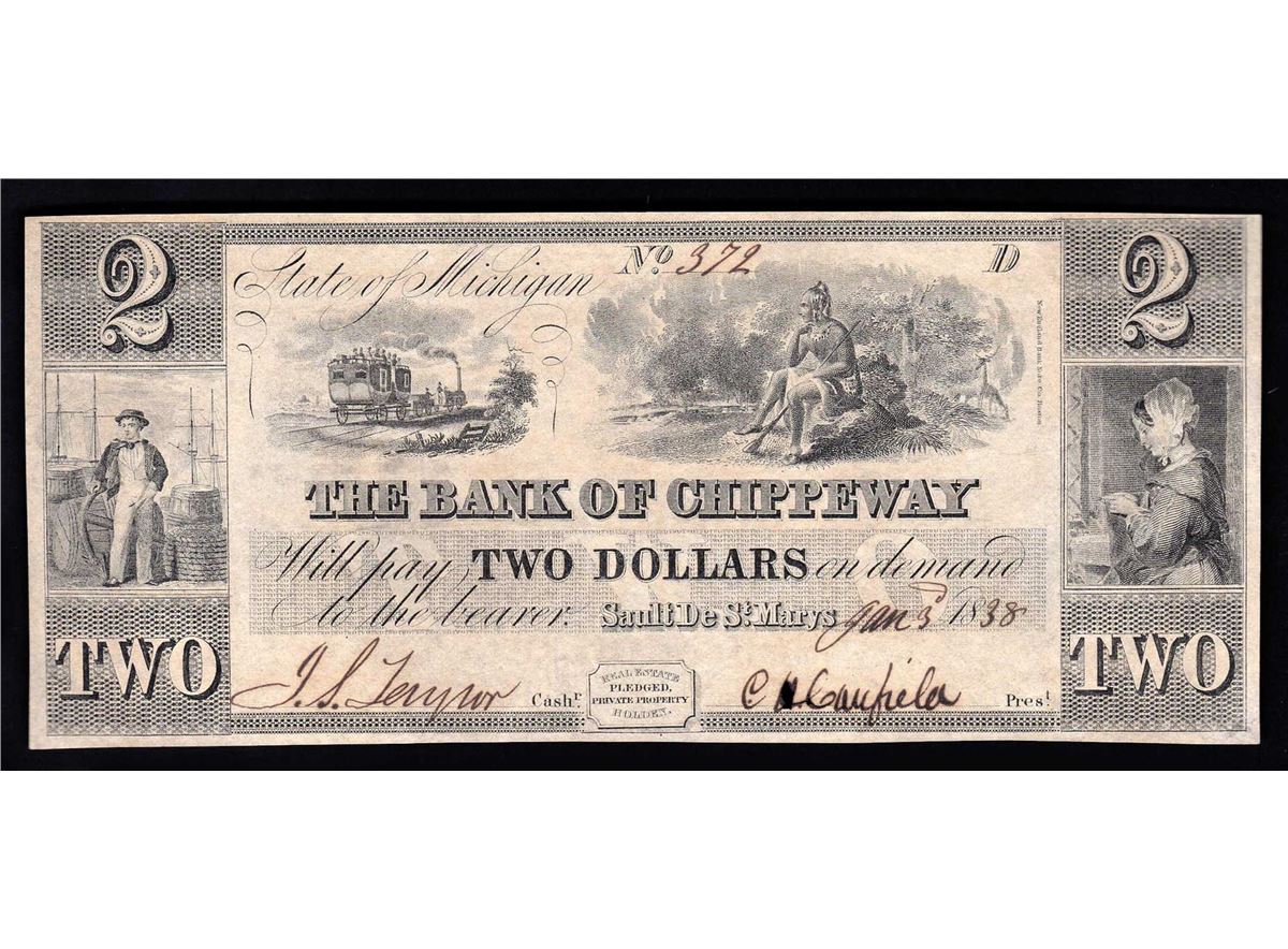 One 1838 $2 The Bank of Chippeway Obsolete Bank Note.