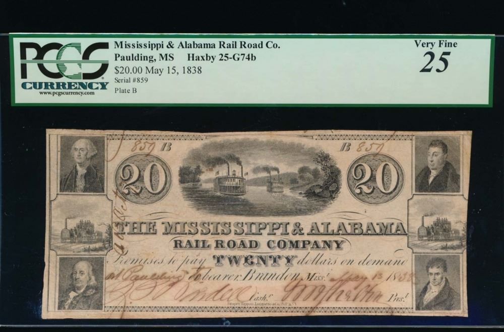 One 1838 $20 Rail Road Company Obsolete Note PCGS 25.