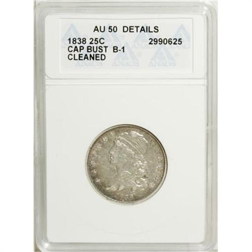 <B>1838 25C Cap Bust-- Cleaned--ANACS. AU50 Details.</B></I> B-1. NGC Census: (8/105). PCGS Population (12/78). Mintage: 366,000. Numismedia Wsl. Price for NGC/PCGS coin in AU50: $555. (#5357)<BR><BR><B>Coin Engraver:</B> William Kneass<BR><BR><b>Shipping:</b> Coins & Currency (<a target="_blank" href="http://www.heritageauctions.com/common/shipping.php">view shipping information</a>\)
