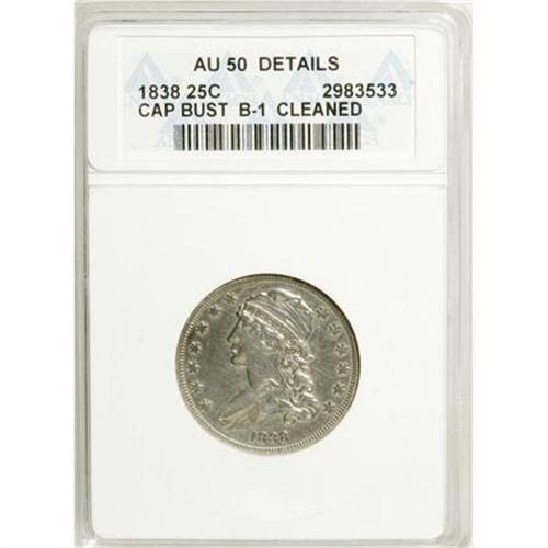 <B>1838 25C --Cleaned--ANACS. AU50 Details.</B></I> B-1. NGC Census: (8/105). PCGS Population (12/77). Mintage: 366,000. Numismedia Wsl. Price for NGC/PCGS coin in AU50: $555. (#5357)<BR><BR><B>Coin Engraver:</B> William Kneass<BR><BR><b>Shipping:</b> Coins & Currency (<a target="_blank" href="http://www.heritageauctions.com/common/shipping.php">view shipping information</a>)