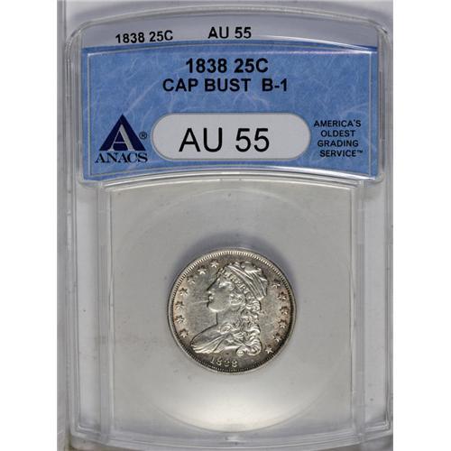 1838 25C AU55 ANACS. B-1, R.1. The only dies for this 1838