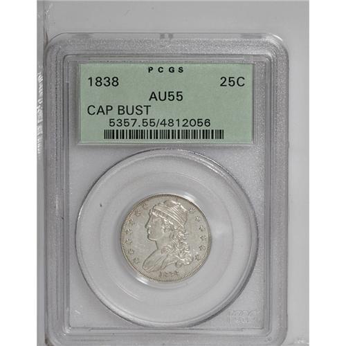 <B>1838<25C> AU55 PCGS.</B></I> B-1, R.1. A somewhat reflective coin with traces of wear. Deeply struck with some handling marks, the most obvious one appearing to the right of the bust.