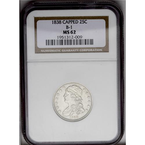 1838 25C MS62 NGC. B-1, R.1. Essentially untoned with 1838[25C] MS62 NGC.
