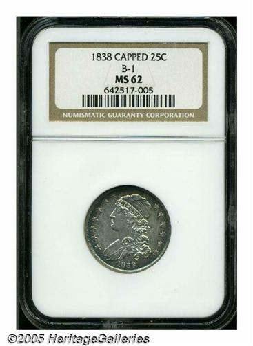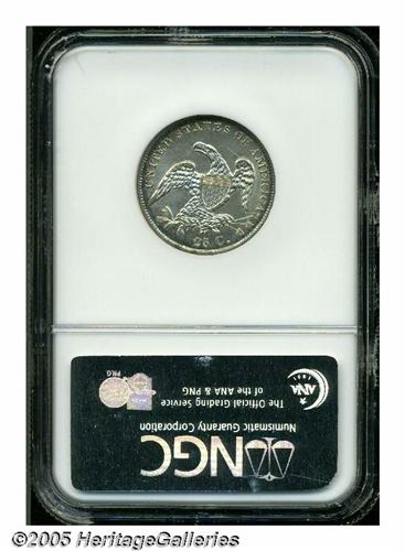 1838 25C MS62 NGC. B-1, R.1. Sea-green and plum c