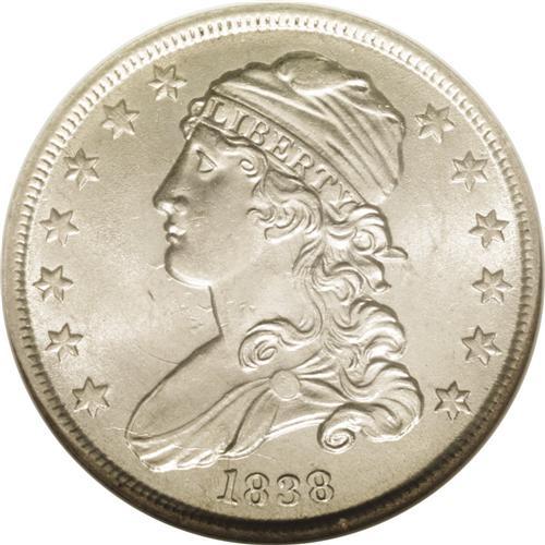<B>1838<25C> MS64 NGC.</B></I> B-1, R.1. Only one pair of dies was used to coin Capped Bust quarters in 1838, the final year of the type. The Seated Liberty began its long reign later the same year. Light tan patina visits the obverse. The reverse is brilliant, and both sides are lustrous. The fields and devices are splendidly smooth, and the only possible complaint is slight striking softness on the left side stars. Struck from boldly clashed dies. Census: 18 in 64, 6 finer (6/06).