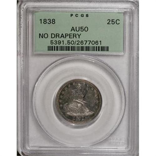 <B>1838 25C No Drapery AU50 PCGS.</B></I> PCGS Population (12/85). NGC Census: (5/104). Mintage: 466,000. Numismedia Wsl. Price for NGC/PCGS coin in AU50: $475. (#5391)<BR><BR><B>Coin Engraver:</B> Christian Gobrecht<BR><BR><b>Shipping:</b> Coins & Currency (<a target="_blank" href="http://www.heritageauctions.com/common/shipping.php">view shipping information</a>)