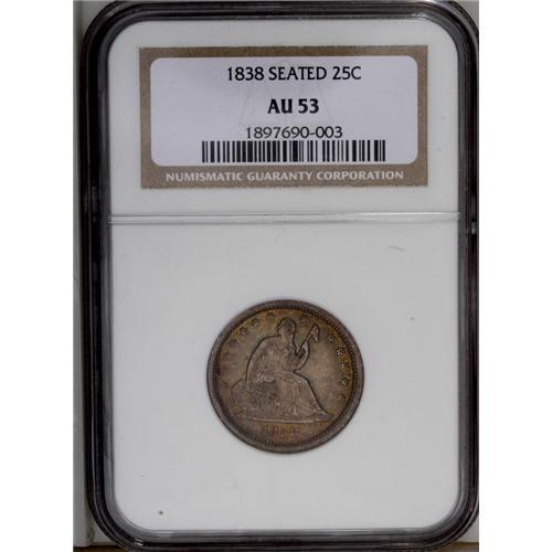 <B>1838<25C> No Drapery AU53 NGC.</B></I> Lightly worn but nicely detailed with rose and orange patina. Traces of luster remain at the periphery of this type coin from the early steampower era.