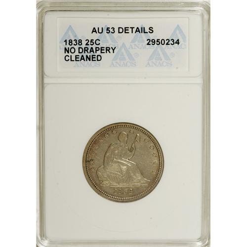 <B>1838 25C No Drapery--Cleaned--ANACS. AU53 Details.</B></I> NGC Census: (4/97). PCGS Population (3/79). Mintage: 466,000. Numismedia Wsl. Price: $467. (#5391)<BR><BR><b>Shipping:</b> Coins & Currency (<a target="_blank" href="http://www.heritageauctions.com/common/shipping.php">view shipping information</a>)