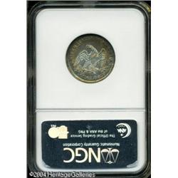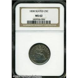 1838 25C No Drapery MS62 NGC. Nicely struck design <B>1838 25C No Drapery MS62 NGC.</B></I> Nicely struck design elements, with a melange of cobalt-blue, violet, olive, and orange patina. the surfaces are relatively free of notable marks. Population: 19 in 62, 50 finer (10/04). <BR><BR><B>Important notice:</B> Heritage usually auctions material at the rate of 200-250 lots per hour. On some occasions eBay Live bid software or the Internet may not be able to keep up with the pace of the auction. We recommend placing a realistic absentee bid now as insurance to avoid disappointment. Occasionally the auctioneer may eliminate or reject an eBay Live bid, and the auctioneer may also reopen a lot after the close of the eBay live bidding (usually because we missed an audience bid), and may reject your bid even if it shows you as the winning bidder. By bidding via eBay Live, you agree that Heritage may award the lot to another bidder at its sole discretion under the circumstances described above or any other reasonable circumstances. Since eBay bids are not shown to us until we open the lot on the floor, we treat those bids just like floor bids. In most cases the floor responds before the eBay bid is presented to us, due to Internet lag time, so for consistency we have made it a policy that floor bids are always considered first over tie eBay live bids. Also please note that all Heritage lots purchased through eBay Live carry a 20% Buyer's Premium. Please make sure you read the Terms and Conditions before you bid. This lot is being auctioned in conjunction with a live floor auction by Heritage Galleries & Auctioneers. All final auction and invoice information will be supplied by Heritage Galleries & Auctioneers, and all other information should be considered preliminary. Lot:5879