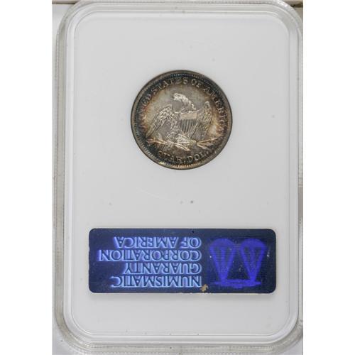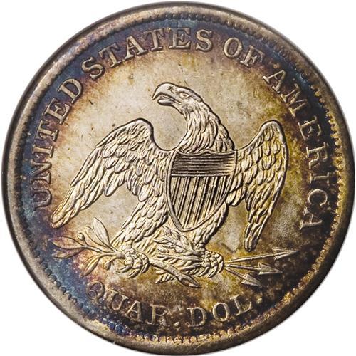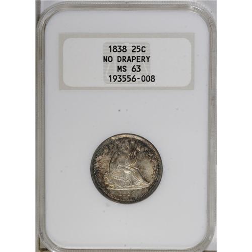 <B>1838 25C No Drapery MS63 NGC.</B></I> Open Claws Reverse. First year of issue for the modified Seated Liberty design by Christian Gobrecht. As with most 1838 quarters, this piece shows strong mint frost. The strike is sharp in most areas, except on the head and stars on each side, as pointed out in the Greer reference (1991). Light orange and blue toning is seen over each side, and there are a few tiny pinpricks present on this attractive coin. Census: 19 in 63, 27 finer (10/06).<BR><BR><b>Shipping:</b> Coin/Currency (<a target="_blank" href="http://www.heritageauctions.com/common/shipping.php">view shipping information</a>)
