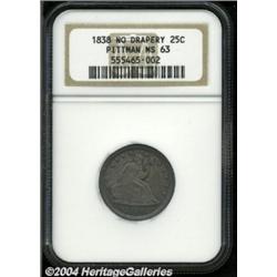 <table><tbody><tr><td><table> <TR><TD width="100%"><TABLE cellSpacing=1 cellPadding=3 width="100%" border=0><TBODY><TR><TD width="100%" bgColor=#79735c><FONT face=arial color=#ffffff size=3><B>Description</B> </FONT></TD></TR><TR><TD width="100%" bgColor=#ffffff><FONT face=arial size=2><B>1838 25C No Drapery MS63 NGC.</B></I> Ex: Pittman. This was the first year of the Liberty Seated quarter design type. This example is well struck, with slight flatness on star 8, and the usual weakness near the borders. The surfaces are very clean, with a couple of small bagmarks noted on the obverse, and several more near the reverse center. Deep purple-mauve toning blankets each side, with muted lavender-blue color near the rims. Despite a seemingly high mintage of 466,000 pieces, this date remains elusive in Mint State. Population: 17 in 63, 28 finer (11/03). <BR><I>Ex: The John Jay Pittman Collection (David Akers, 5/98), Lot 1297, where it realized $4,675.</B></I> </FONT></TD></TR></TBODY></TABLE></TD></TR></TBODY></TABLE><BR><A name=PricesRealized></A><TABLE cellSpacing=0 cellPadding=0 width="100%" bgColor=#000000 border=0><TBODY><TR><TD width="100%"><TABLE cellSpacing=1 cellPadding=3 width="100%" border=0><TBODY><TR><TD width="100%" bgColor=#79735c><A name=PR><FONT face=arial color=#ffffff size=3><B>Previous Prices from Heritage Auctions</B> </FONT></A></TD></TR><TR><TD bgColor=#f6f6ed><TABLE cellSpacing=0 cellPadding=0 width="100%" border=1><TBODY><TR><TD align=middle width="33%"><B>Date</B></TD><TD align=middle width="33%"><B>Service</B></TD><TD align=middle width="33%"><B>Price</B></TD></TR><TR bgColor=whitesmoke><TD width="33%"><B>07/29/2003</B></TD><TD width="33%">PCGS</TD><TD width="33%">$4,600.00</TD></TR><TR bgColor=whitesmoke><TD width="33%"><B>08/06/2001</B></TD><TD width="33%">PCGS</TD><TD width="33%">$3,910.00</TD></TR></TBODY></TABLE></TD></TR><TR><TD bgColor=#ffffff><FONT face=arial size=1 ?>PLEASE NOTE: All prices realized reflect the final hammer price PLUS the buyer's premium in auctions that charge a buyer's premium. Each item has a notation at the top of the listing indicating whether that lot included a buyer's premium. Example: A item that sells with a final hammer price of $100 and a 20% buyer's premium will display with a price realized of $120. All information listed is intended to be as accurate as possible, but errors are possible. Please use this guide carefully and inform us of any inaccuracies. </FONT></TD></TR></TBODY></TABLE></TD></TR></TBODY></TABLE><BR><TABLE cellSpacing=0 cellPadding=0 width="100%" bgColor=#000000 border=0><TBODY><TR><TD width="100%"><TABLE cellSpacing=1 cellPadding=3 width="100%" border=0><TBODY><TR><TD width="100%" bgColor=#79735c colSpan=6><FONT face=arial color=#ffffff size=3><B>Price Guide*</B> </FONT></TD></TR><TR bgColor=#f6f6ed><TD align=middle><B>Grade</B> </TD><TD align=middle><B>Coin World<BR>(Trends)</B> </TD><TD align=middle><B>Numismedia<BR>Retail</B> </TD><TD align=middle><B>Numismedia<BR>Wholesale</B> </TD><TD align=middle><B>Coin<BR>Universe</B> </TD><TD align=middle><B>Heritage<BR>Value Index</B> </TD></TR><TR bgColor=#ffffff><TD align=middle>62</TD><TD align=right>$2,500.00</TD><TD align=right>---</TD><TD align=right>$1,450.00</TD><TD align=right>---</TD><TD align=right>$2,151.72</TD></TR><TR style="FONT-WEIGHT: bold" bgColor=#cccfdd><TD align=middle>63</TD><TD align=right>$4,500.00</TD><TD align=right>---</TD><TD align=right>$2,775.00</TD><TD align=right>$4,700.00</TD><TD align=right>$3,124.67</TD></TR><TR bgColor=#ffffff><TD align=middle>64</TD><TD align=right>$8,500.00</TD><TD align=right>---</TD><TD align=right>$4,370.00</TD><TD align=right>$9,500.00</TD><TD align=right>$6,225.00</TD></TR><TR bgColor=#ffffff><TD colSpan=6><FONT size=1>*All information listed is intended to be as accurate as possible, but errors are possible. No item may be returned or refused based on this information which is provided as a service to our customers. You should contact each pricing source directly to determine the accuracy of this information. </FONT></TD></TR></TBODY></TABLE></TD></TR></TBODY></TABLE><BR><TABLE cellSpacing=0 cellPadding=0 width="100%" bgColor=#000000 border=0><TBODY><TR><TD width="100%"><TABLE cellSpacing=1 cellPadding=3 width="100%" border=0><TBODY><TR><TD width="100%" bgColor=#79735c><FONT face=arial color=#ffffff size=3><B>Population Guide</B> </FONT></TD></TR><TR bgColor=#ffffff><TD align=middle><!-- Begin Output of Population Grid--><TABLE cellSpacing=0 cellPadding=0 width="100%" border=0><TBODY><TR><TD vAlign=center><TABLE cellSpacing=0 width="100%" border=1 cellsadding="3"><TBODY><TR><TD vAlign=center><TABLE cellSpacing=0 cellPadding=3 width="100%" border=1><TBODY><TR><TD vAlign=center align=middle bgColor=#f0f1e8 colSpan=2 <CENTER><FONT face=Arial size=2><B>PCGS Pop </B></FONT><CENTER></CENTER></TD><TD vAlign=center align=middle bgColor=#f0f1e8 colSpan=2><CENTER><FONT face=Arial size=2><B>NGC Pop</B></CENTER></FONT></TD></TR><TR><TD vAlign=center><FONT face=Arial size=2>(63)</FONT> </TD><TD vAlign=center align=right><FONT face=Arial size=2>11</FONT> </TD><TD vAlign=center><FONT face=Arial size=2>(63)</FONT> </TD><TD vAlign=center align=right><FONT face=Arial size=2>17</FONT> </TD></TR><TR><TD vAlign=center><FONT face=Arial size=2>(>63)</FONT> </TD><TD vAlign=center align=right><FONT face=Arial size=2>26</FONT> </TD><TD vAlign=center><FONT face=Arial size=2>(>63)</FONT> </TD><TD vAlign=center align=right><FONT face=Arial size=2>28</FONT> </TD></TR></TBODY></TABLE></TD></TR></TBODY></TABLE></TD></TR></TBODY></TABLE><!-- End Output of Population Grid--></TD></TR></TBODY></TABLE></TD></TR></TBODY></TABLE><BR><TABLE cellSpacing=0 cellPadding=0 width="100%" bgColor=#000000 border=0><TBODY><TR> <font color='#000000'><span style='background-color: #FFFFFF'><td bgcolor='#FFFFFE'> Important notice: Heritage usually auctions material at the rate of 200-250 lots per hour. On some occasions eBay Live bid software or the Internet 