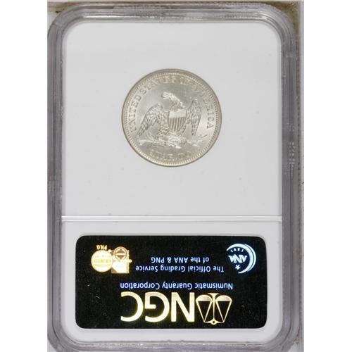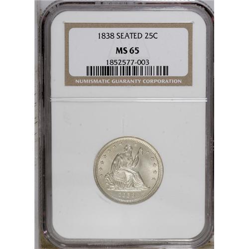 <B>1838 25C No Drapery MS65 NGC.</B></I> Open Claws Reverse. This lustrous first-year Seated quarter has only a hint of olive toning. The fields are splendidly void of consequential contact, and the strike is exacting aside from minor softness on Liberty's toes. Struck from early, unclashed dies. Among Philadelphia issues, only the 1838 and 1839 lack drapery beneath Liberty's raised elbow. Some of the 1840-O halves are also No Drapery, and these three early dates complete the popular No Drapery subtype. The 1838 is plentiful in typical circulated grades, but is scarce above VF and emerges as a notable rarity at the MS65 level. Census: 4 in 65, 3 finer (10/06).<BR><BR><b>Shipping:</b> Coin/Currency (<a target="_blank" href="http://www.heritageauctions.com/common/shipping.php">view shipping information</a>)