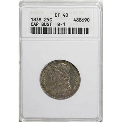 <B>1838 25C XF40 ANACS.</B></I> B-1. NGC Census: (11/126). PCGS Population (19/113). Mintage: 366,000. Numismedia Wsl. Price for NGC/PCGS coin in XF40: $300. (#5357)<BR><BR><B>Coin Engraver:</B> William Kneass<BR><BR><b>Shipping:</b> Coins & Currency (<a target="_blank" href="http://www.heritageauctions.com/common/shipping.php">view shipping information</a>)