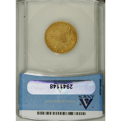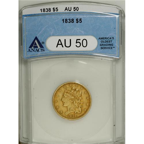 <B>1838 $5 AU50 ANACS.</B></I> Large Arrows, Small 5, Breen-6514, McCloskey 1-A, R.2. The design details are nearly full on both sides. Attractive lime and red-orange patina adorns each side. A few minor marks and faint highpoint wear define the grade.<BR><BR><b>Shipping:</b> Coins & Currency (<a target="_blank" href="http://www.heritageauctions.com/common/shipping.php">view shipping information</a>)