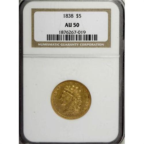 <B>1838 $5 AU50 NGC.</B></I> Large Arrows, Small 5, Breen-6514, McCloskey 1-A, R.2. The pleasing orange-gold surfaces show only light field chatter with premium eye appeal. The reverse is sharp and attractive for the assigned grade.<BR><BR><B>Coin Engraver:</B> William Kneass<BR><BR><b>Shipping:</b> Coins & Currency (<a target="_blank" href="http://www.heritageauctions.com/common/shipping.php">view shipping information</a>)
