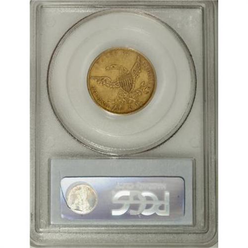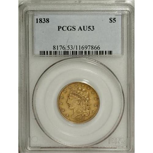 <B>1838 $5 AU53 PCGS.</B></I> Large Arrows, Small 5, Breen-6514, McCloskey 1-A, R.2. A lovely representative from the final year of the short-lived type. Golden-brown luster outlines the richly defined design elements, and the slightly subdued fields are void of distracting marks.<BR><BR><b>Shipping:</b> Coins & Currency (<a target="_blank" href="http://www.heritageauctions.com/common/shipping.php">view shipping information</a>)
