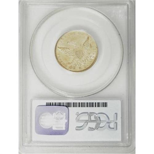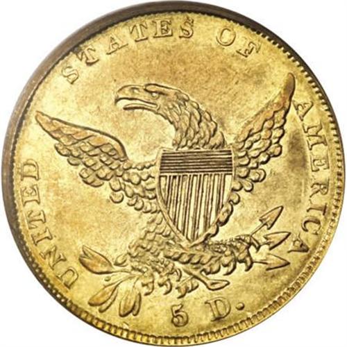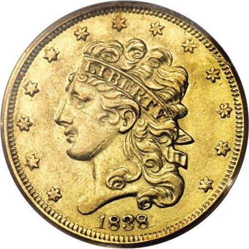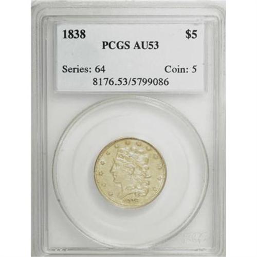 <B>1838 $5 AU53 PCGS.</B></I> Large Arrows, Small 5, Breen-6514, McCloskey 1-A, R.2. This piece is notably less abraded for the grade than most specimens seen in AU grades, although a single scrape below Liberty's eye bears singular mention. Delightful luster encompasses both sides of this charming green-gold example. <BR><BR><B>Coin Engraver:</B> William Kneass<BR><BR><b>Shipping:</b> Coins & Currency (<a target="_blank" href="http://www.heritageauctions.com/common/shipping.php">view shipping information</a>)