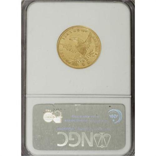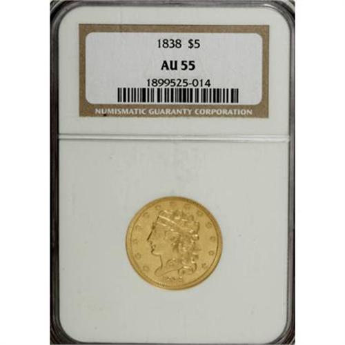 <B>1838 $5 AU55 NGC.</B></I> Small Arrows, Large 5, Breen-6515, McCloskey 2-B, R.2. The arrowheads are compact compared to the 1-A die pair. This well-defined Choice AU piece, yellow-gold with a hint of green, has wear only in small, isolated patches, with one such area appearing at Liberty's forehead.<BR><BR><B>Coin Engraver:</B> William Kneass<BR><BR><b>Shipping:</b> Coins & Currency (<a target="_blank" href="http://www.heritageauctions.com/common/shipping.php">view shipping information</a>)