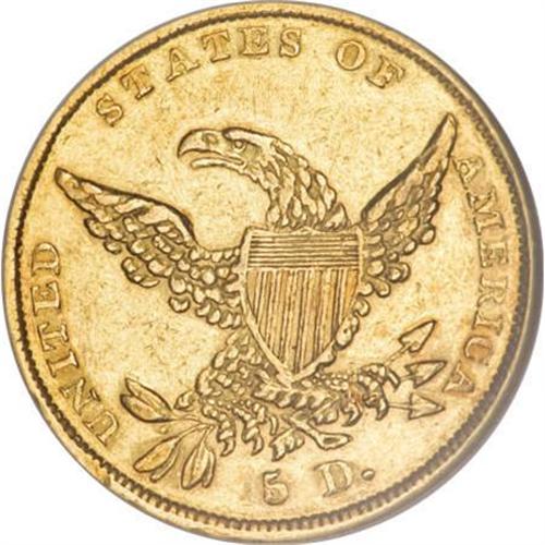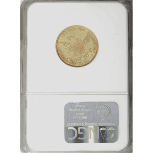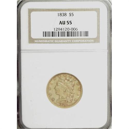 <B>1838 $5 AU55 NGC.</B></I> Large Arrows, Small 5, Breen-6514, McCloskey 1-A, R.2. A pleasing Choice AU piece with lustrous green and orange-gold surfaces. The fields are satiny and lightly abraded, with nearly full luster.<BR><BR><B>Coin Engraver:</B> William Kneass<BR><BR><b>Shipping:</b> Coins & Currency (<a target="_blank" href="http://www.heritageauctions.com/common/shipping.php">view shipping information</a>)