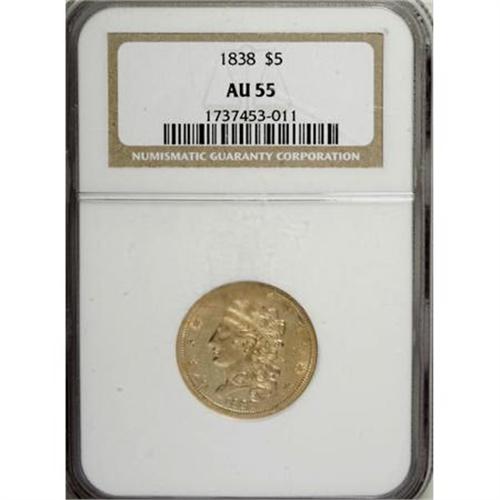 <B>1838 $5 AU55 NGC.</B></I> Small Arrows, Large 5, Breen-6515, McCloskey 2-B, R.2. Lightly abraded with light yellow surfaces. A pleasing and appealing Choice AU piece.<BR><BR><B>Coin Engraver:</B> William Kneass<BR><BR><b>Shipping:</b> Coins & Currency (<a target="_blank" href="http://www.heritageauctions.com/common/shipping.php">view shipping information</a>)