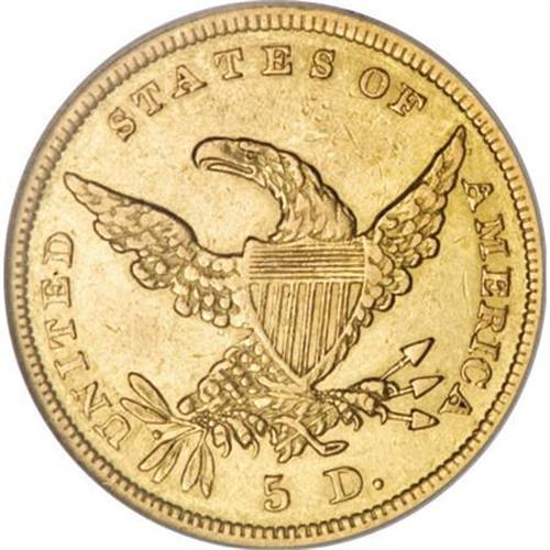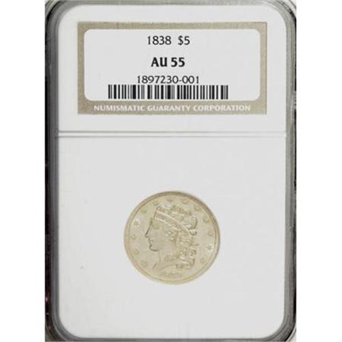 <B>1838 $5 AU55 NGC.</B></I> Small Arrows, Large 5, Breen-6515, McCloskey 2-B, R.2. Lustrous light yellow with strong design elements. A few minor abrasions are evident on each side.<BR><BR><B>Coin Engraver:</B> William Kneass<BR><BR><b>Shipping:</b> Coins & Currency (<a target="_blank" href="http://www.heritageauctions.com/common/shipping.php">view shipping information</a>)