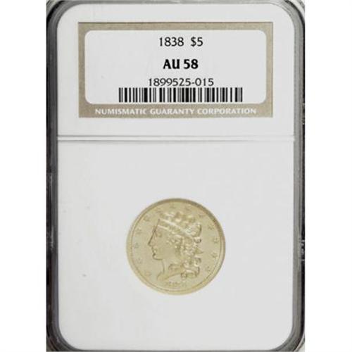 <B>1838 $5 AU58 NGC.</B></I> Small Arrows, Large 5, Breen-6515, McCloskey 2-B, R.2. This boldly struck near-Mint Classic five has bright surfaces that are smooth aside from a pair of moderate field marks near the profile. Slight friction on the eyebrow and the curl above the ear confirms momentary circulation.<BR><BR><B>Coin Engraver:</B> William Kneass<BR><BR><b>Shipping:</b> Coins & Currency (<a target="_blank" href="http://www.heritageauctions.com/common/shipping.php">view shipping information</a>)