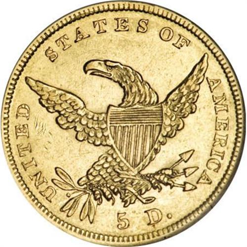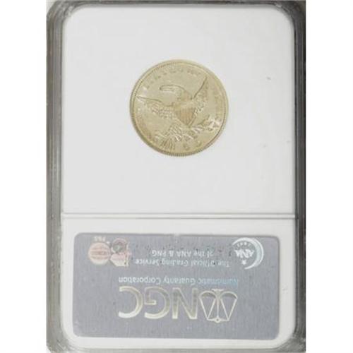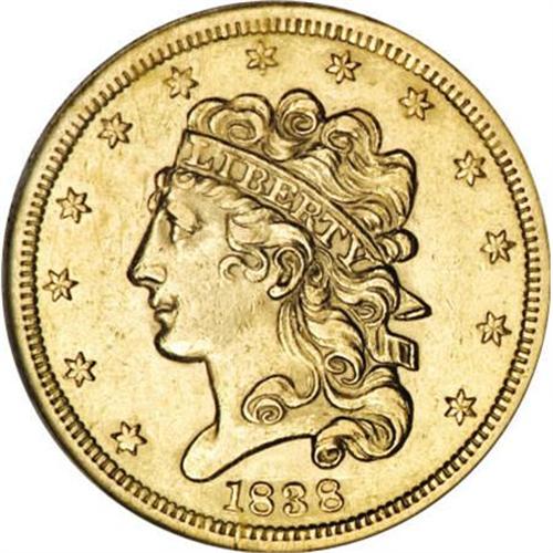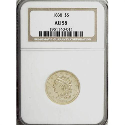 <B>1838 $5 AU58 NGC.</B></I> Small Arrows, Large 5, Breen-6515, McCloskey 2-B, R.2. A lustrous piece with well defined design motifs and pleasing yellow-gold coloration. Some of Liberty's hair curls and the eagle's wing tips exhibit minor rub from apparent light circulation. A relatively available issue from a substantial mintage of 286,588 pieces. <BR><BR><B>Coin Engraver:</B> William Kneass<BR><BR><b>Shipping:</b> Coins & Currency (<a target="_blank" href="http://www.heritageauctions.com/common/shipping.php">view shipping information</a>)