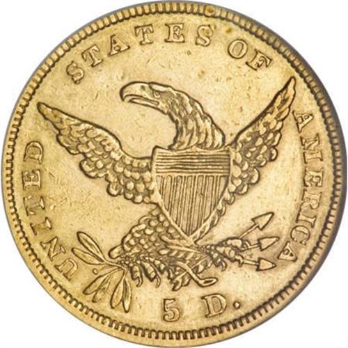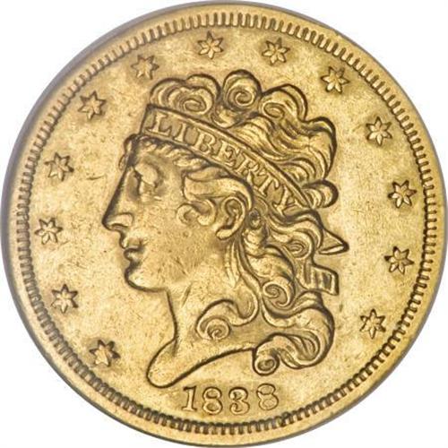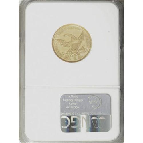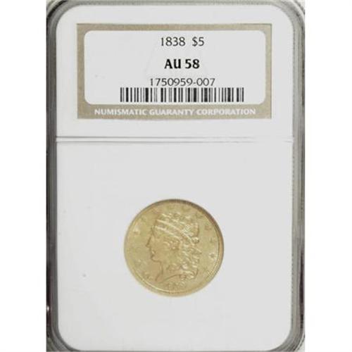 <B>1838 $5 AU58 NGC.</B></I> Small Arrows, Large 5, Breen-6515, McCloskey 2-B, R.2. A slightly reflective example with rich yellow color and nearly complete cartwheel luster on both sides. An attractive and somewhat scarce date (except for multiple pieces in this sale) that is seldom seen so fine.<BR><BR><B>Coin Engraver:</B> William Kneass<BR><BR><b>Shipping:</b> Coins & Currency (<a target="_blank" href="http://www.heritageauctions.com/common/shipping.php">view shipping information</a>)