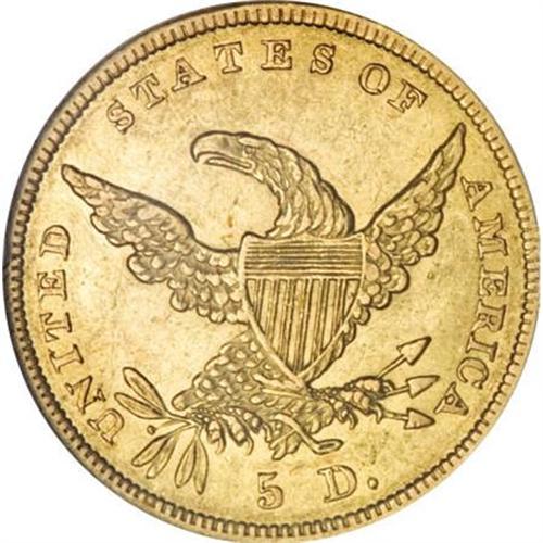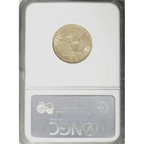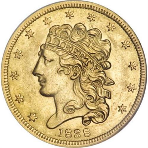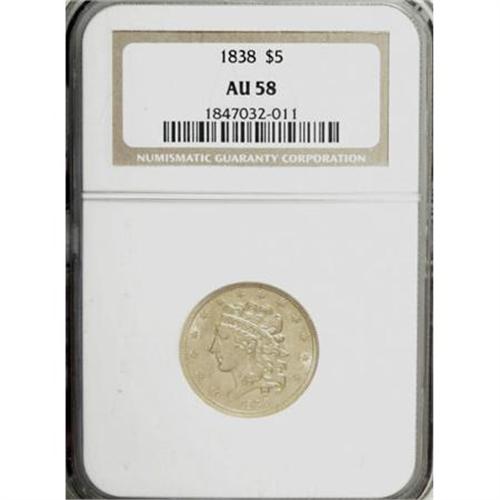 <B>1838 $5 AU58 NGC.</B></I> Small Arrows, Large 5, Breen-6515, McCloskey 2-B, R.2. Two varieties are known, and they are easily distinguished by a quick glance at the reverse. The D in the denomination is centered beneath the branch stem on the 2-B variety, and it is left of center on the 1-A variety. Frosty light yellow surfaces provide exceptional eye appeal to this sharply struck example. Light surface marks on each side are consistent with the grade.<BR><BR><B>Coin Engraver:</B> William Kneass<BR><BR><b>Shipping:</b> Coins & Currency (<a target="_blank" href="http://www.heritageauctions.com/common/shipping.php">view shipping information</a>)