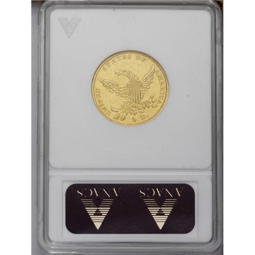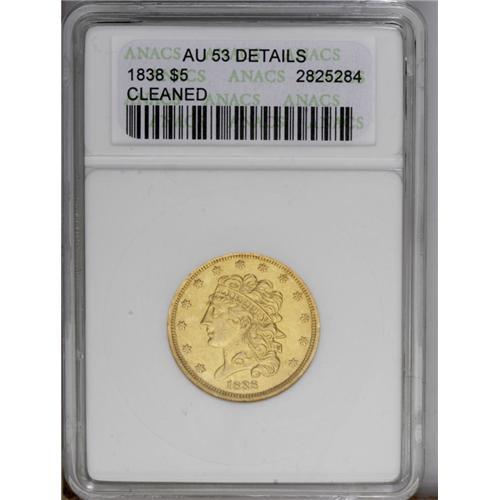 <B>1838<$5>--Cleaned--ANACS. AU53 Details.</B></I> Breen-6514, Large Arrows, Small 5, McCloskey 1-A, R.2. This coin has a bright golden appearance and there are no mentionable abrasions on either side. Fully detailed with minimal highpoint friction and some original luster gleaming through, despite the aforementioned cleaning. The final year of the Classic Head type.