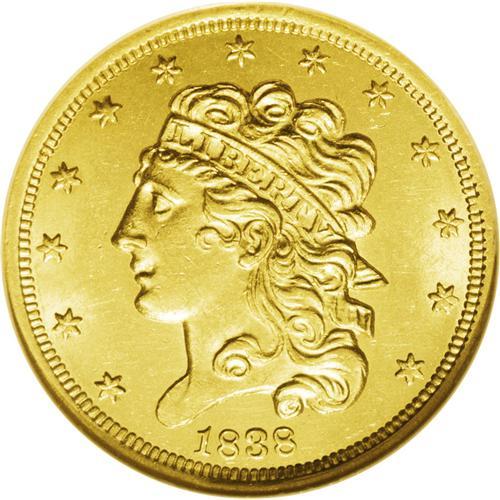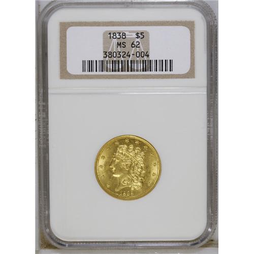 <B>1838 $5 MS62 NGC.</B></I> Breen-6514, Large Arrows, Small 5, McCloskey 1-A, R.2. This splendid final-year type coin has full detail on the major devices, and only portions of the denticles lack complete definition. The fields are smooth and possess ample bright luster. Census: 21 in 62, 25 finer (10/06).<BR><BR><b>Shipping:</b> Coin/Currency (<a target="_blank" href="http://www.heritageauctions.com/common/shipping.php">view shipping information</a>)